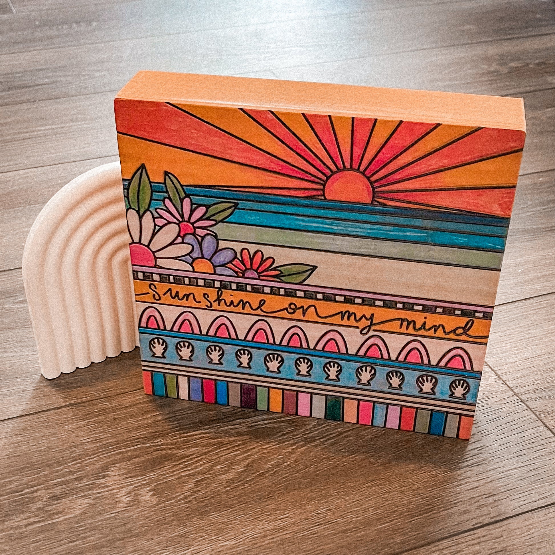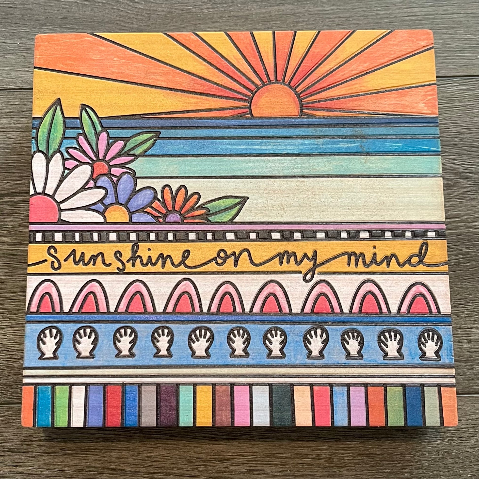 You may be working your 9-5, but sunshine must be on your mind! With its wood-burned and vibrant geometric design, this box sign is sure to take you back to those carefree summer days.